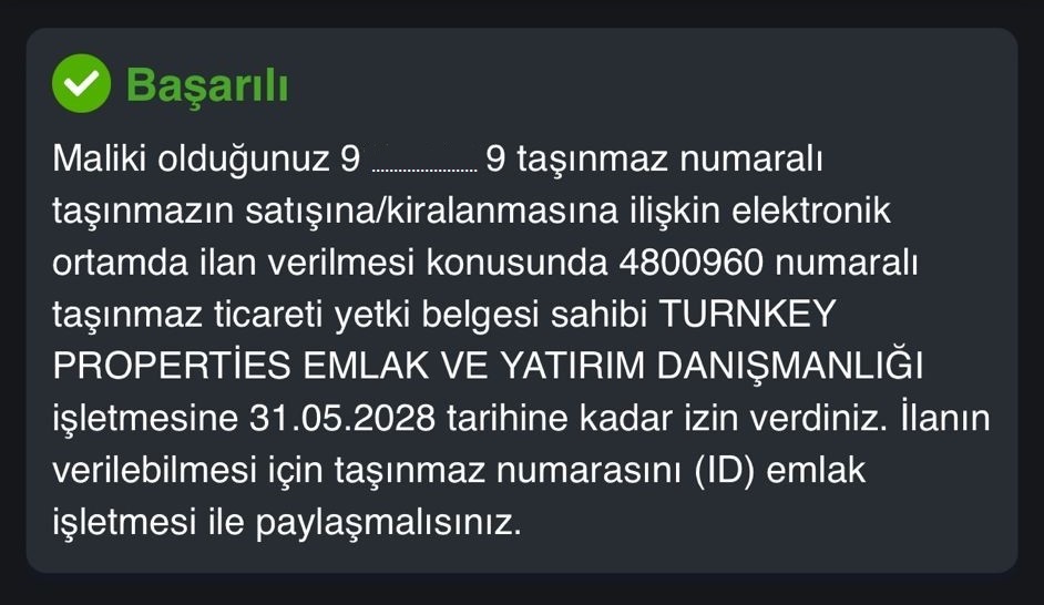 EİDS yetkilendirme işlemi başarıyla tamamlandığında, sistem tarafından aşağıdaki bilgilendirme ekranı görüntülenir. Bu ekranda, taşınmazınızın Turnkey Properties Emlak ve Yatırım Danışmanlığı’na ilan verme yetkisiyle tanımlandığı onaylanır.